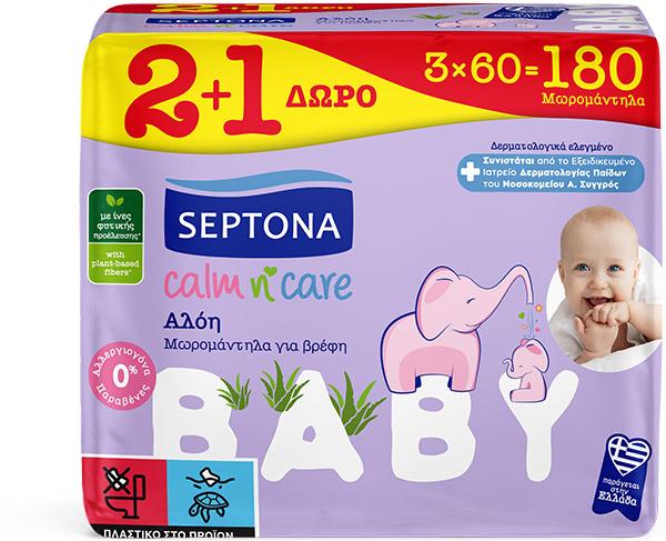 Septona Μωρομάντηλα Baby Calm n Care Με Αλόη 3x60τμχ (2+1 Δώρο)